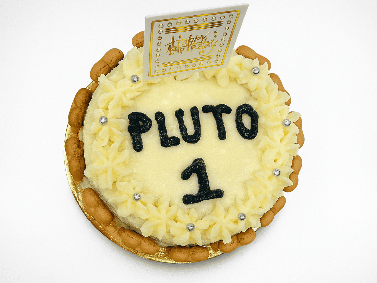A treat your pet will definitely love. Get a Banana Peanut Butter Cake crafted for dogs, designed as a bone-shaped sign that can be personalized with your dog's name, topped with blue frosting. It's a special pet-safe treat for your furry friend's birthday or any celebration.