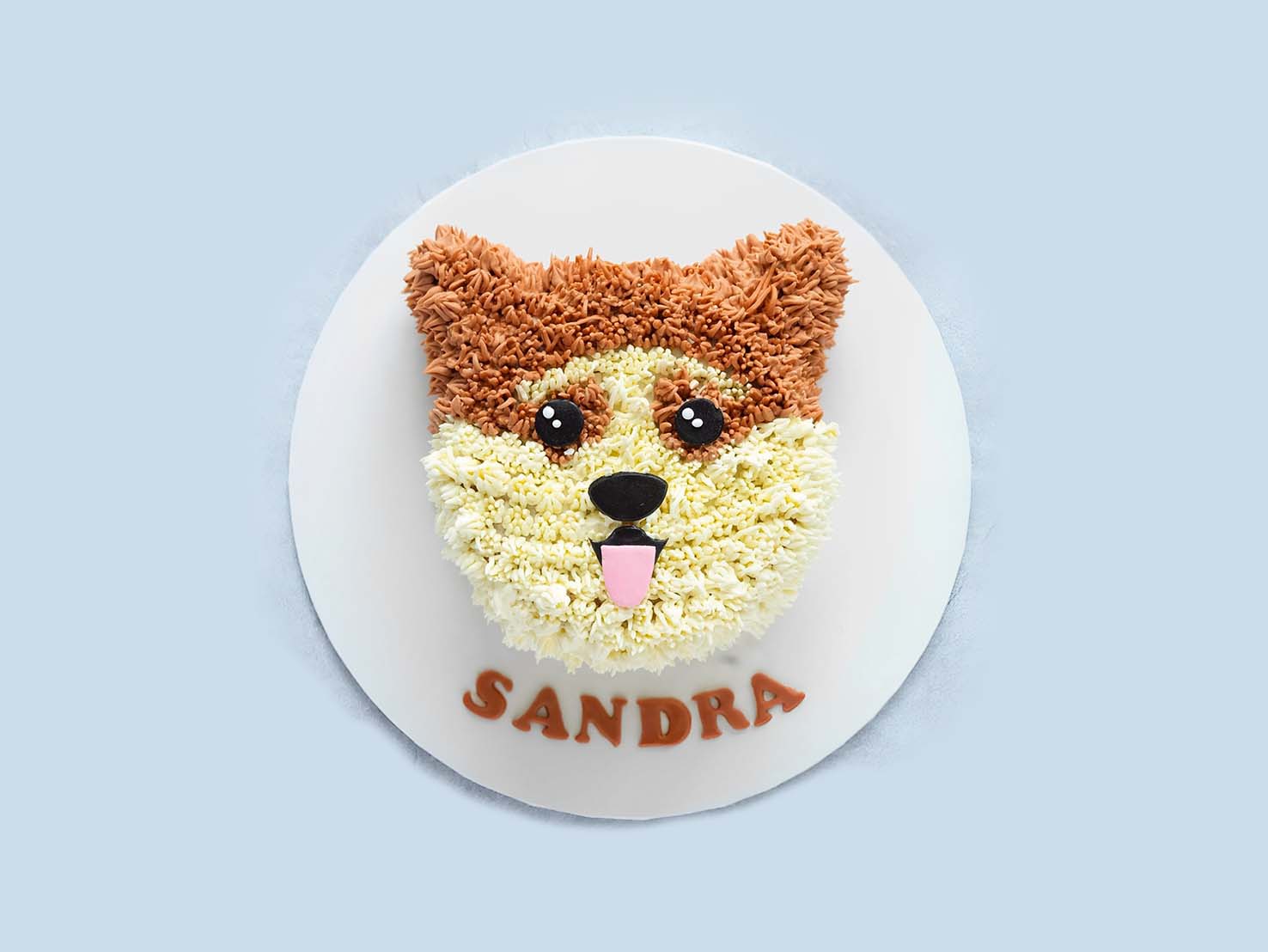 This Corgi Face Cake has a happy face with brown and white frosting, big eyes, and a pink tongue, personalized to make your dog, feel loved on your pup's birthday, Healthy and Delicious ready to serve.