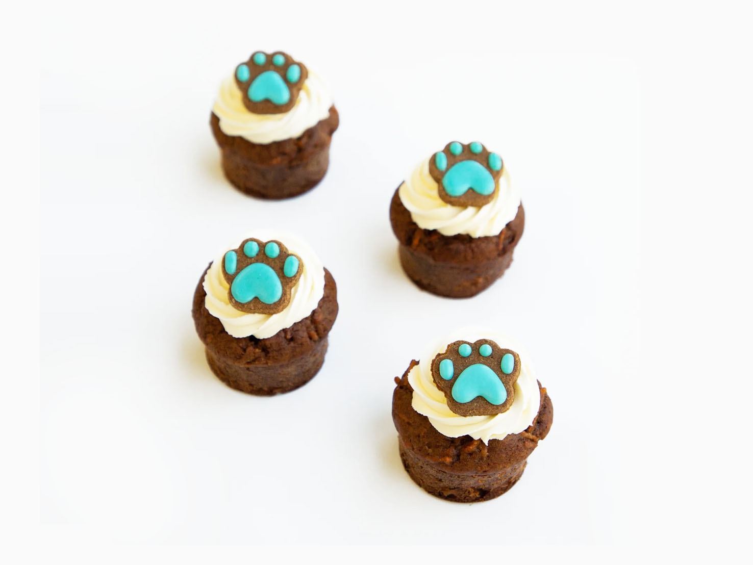 Paw Print Pupcakes are sweet little treats with a creamy swirl and a cute blue paw design print on top. They're just right for giving your dog a special snack on their birthday or any day you want to spoil them. Freshly baked and made with pet-safe ingredients with love and care.